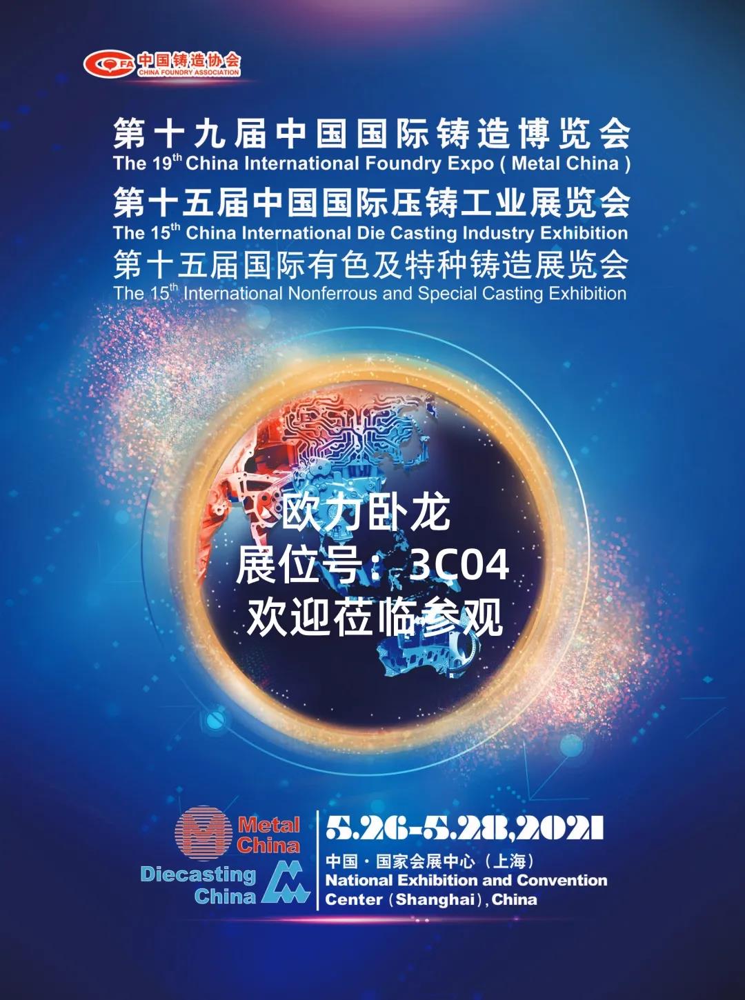 2021年5月26日-28日,,即将在上海·国家会展中心举行第十九届中国国际铸造展览会,,同期举行第十五届中国国际压铸工业展览会及第十五届国际有色特种铸造展览会。。。。。。